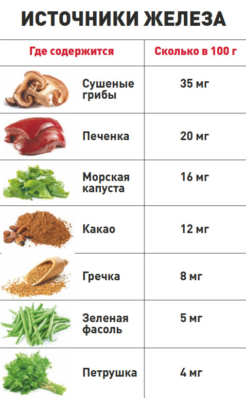 Кроме того, включай в рацион соевые бобы, фасоль, гречку, горох, петрушку, шпинат, грибы (шампиньоны, лисички, белые, подберезовики), яблоки, сушеные абрикосы, чернослив и изюм – они также содержат немало железа.