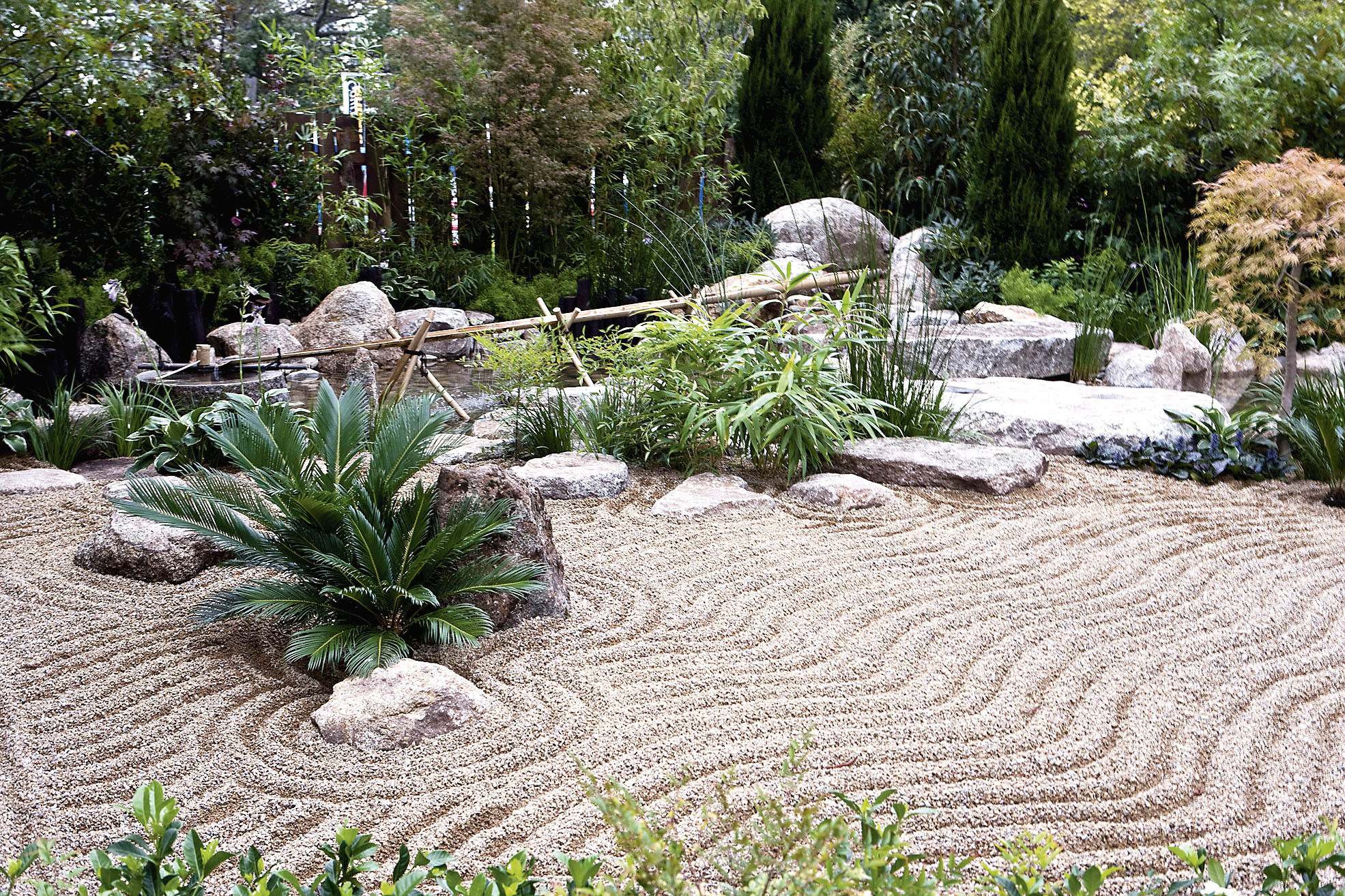 На поверхности «воды» из гравия или песка граблями наносят извилистые линии–волны, а из гальки среднего размера выкладывают «сухие ручьи», по берегам которых располагают более крупные камни. Ширина «ручьев» – величина непостоянная, сухое русло с многочисленными изгибами то сужается, то расширяется. Для полноты картины через него стоит перебросить мостики, внешний вид которых может быть весьма разнообразным: несколько толстых досок, изящная конструкция с перилами и даже крупные плоские камни. Но «сухие» ручьи не заменят настоящую воду, которая присутствует в японском саду в самых разных проявлениях. Например, неглубокий прудик, маленький фонтанчик, живой звонкий ручеек или же большая каменная чаша, наполненная водой.