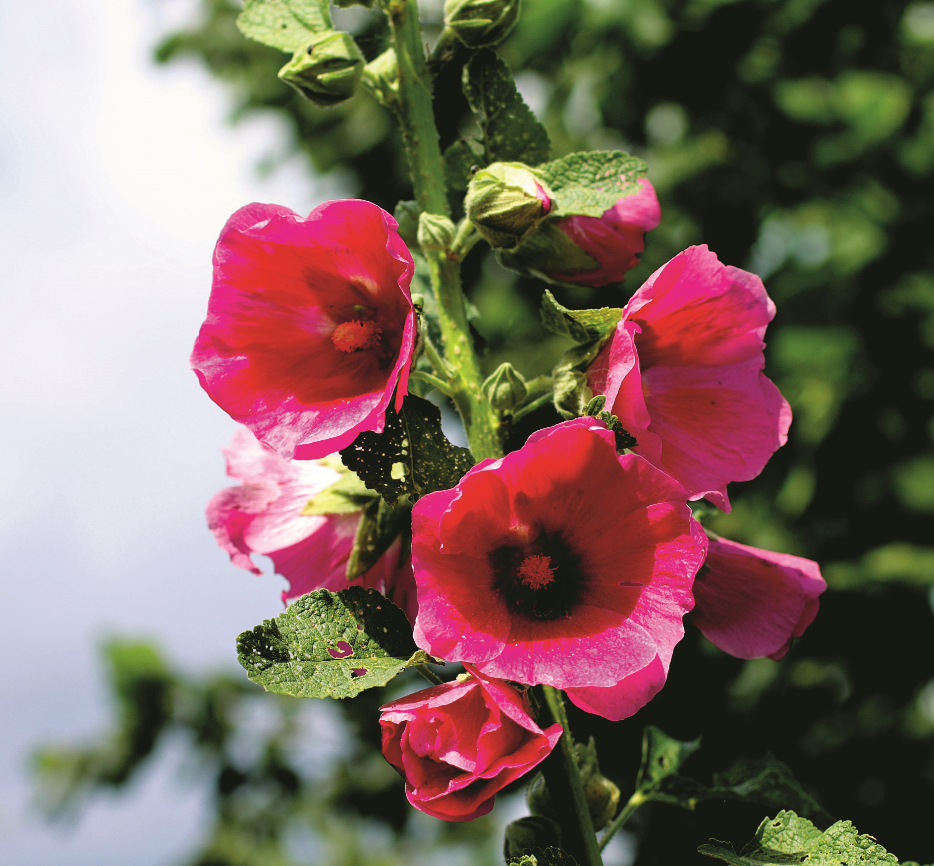 Или шток-роза. Выращивается как двулетник. Образует розетку из пышных соцветий на второй год жизни, окрас лепестков от нежно-розового до золотистого и шоколадного. Высота достигает от 80 см до 2,5 м. Любит светлые места, но выдержит и небольшое притенение. Цветение с июля до конца сентября.
