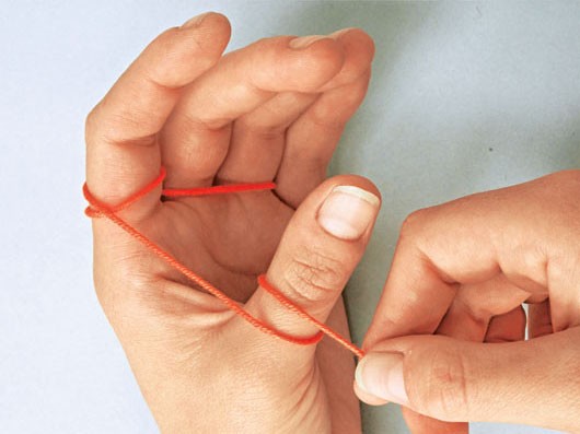 Обмотай нить вокруг указательного и большого пальцев, зажав «хвостик» между безымянным и мизинцем.