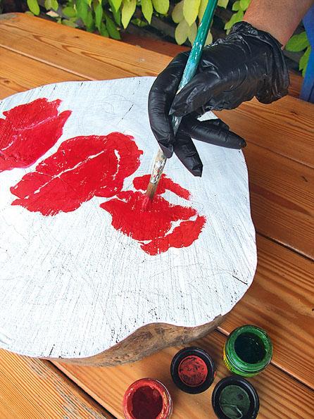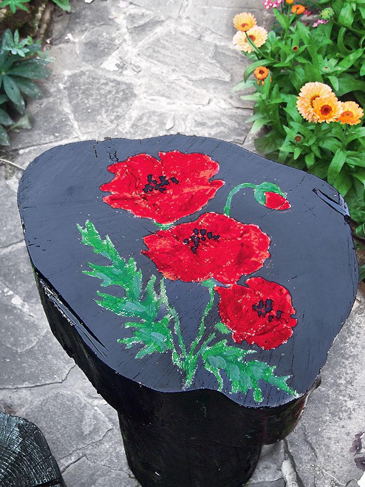 6. Раскрась маки акриловыми красками и оставь на пару часов (в безветренном и недоступном для животных и детей месте!). Все, рисунок готов. Осталось закрасить со всех сторон сам пень.