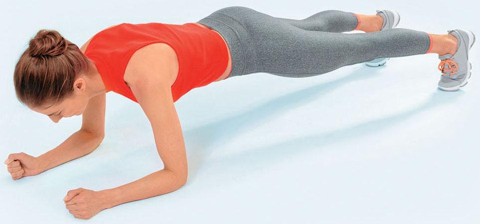 Встань в планку с упором на предплечья. Локти расположены ровно под плечами, живот втянут, спина ровная (без прогиба в пояснице!). В этом положении раскачивайся с небольшой амплитудой. При движении вперед плечи должны оказаться перед локтями, а при движении назад – за локтями.