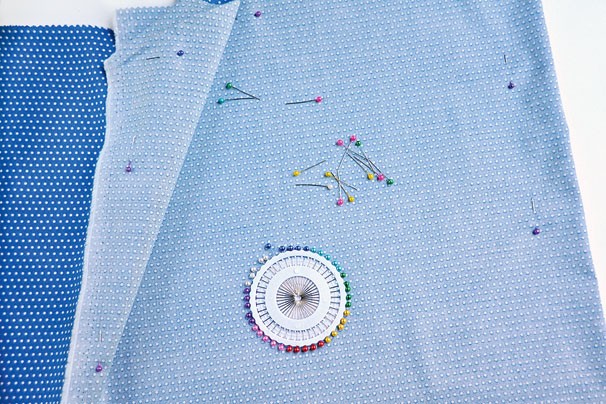 1. Отпарь две одинаковых части ткани и сложи пополам лицевыми сторонами друг к другу. Соедини в центре специальными иглами.