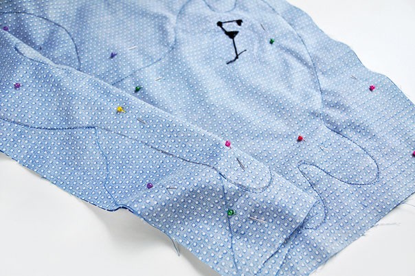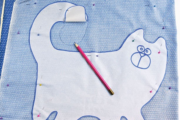 2. К изнаночной стороне ткани приложи выкройку кота (отступив от краев по 5 см). Приколи ее иглами и обведи карандашом по контуру.