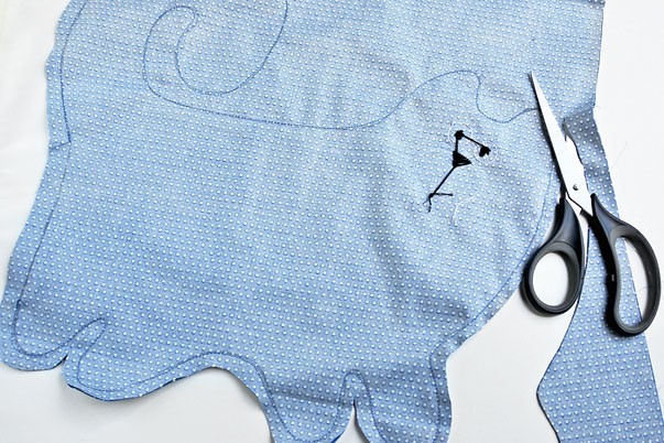 7. Снова зафиксируй прямоугольники булавками (друг к другу). Стачи по отмеченному контуру кота, оставив отверстие для набивки.