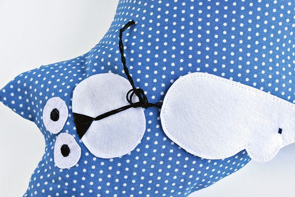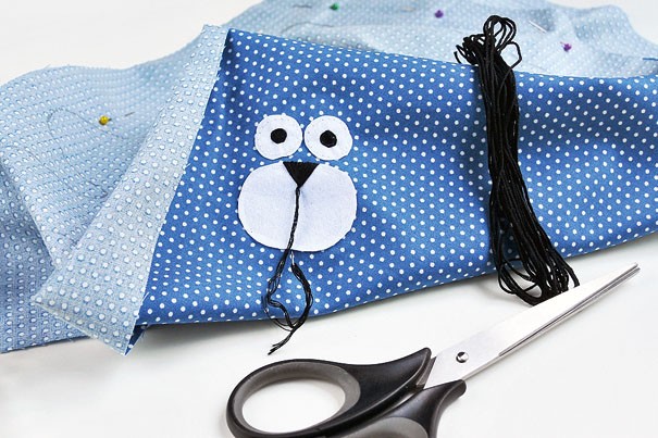 5. Отметь на лицевой стороне ткани расположения глаз и мордочки. Зафиксируй круги из фетра иглами для закалывания и притачи их по кругу, отступая от края примерно около 0,3 см.