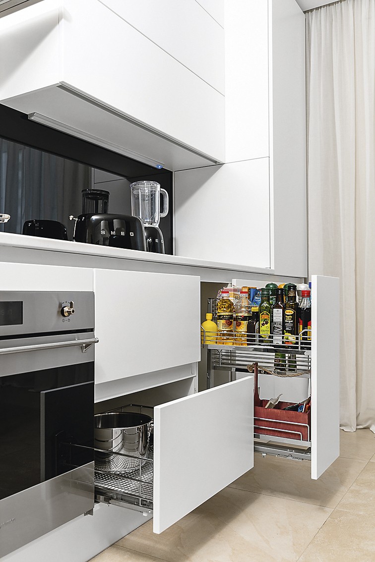 - Выдвижные ящики и сетчатые выкатные системы хранения функциональнее и удобнее шкафов с распашными дверцами и статичными полками. Они избавляют от необходимости лишний раз наклоняться и вынимать часть содержимого, чтобы добраться до нужных предметов и продуктов, расположенных в глубине.