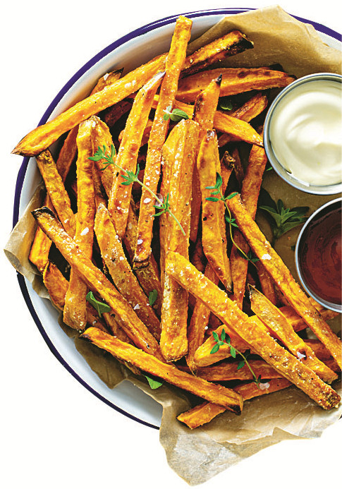 Можно: не из обычной картошки, а из батата. Сладкий картофель (который, кстати, не имеет с обычным картофелем ничего общего, кроме формы) содержит крахмал, зато богат витамином А и не требует соуса, так как вкус у него и так очень насыщенный.