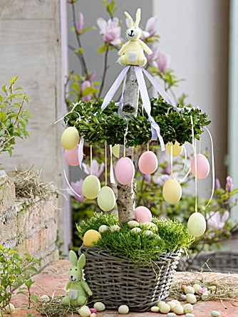 Купи пластиковые яйца и подвесь их на веревочки по всей окружности венка. Макушку «дерева» укрась фигуркой кролика.