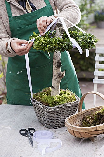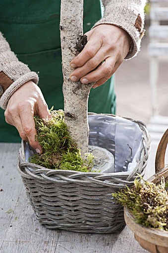 Вставь крепкую ветку (ок. 40 см) в кашпо с песком, а далее – в корзину. Задекорируй сверху искусственным мхом.