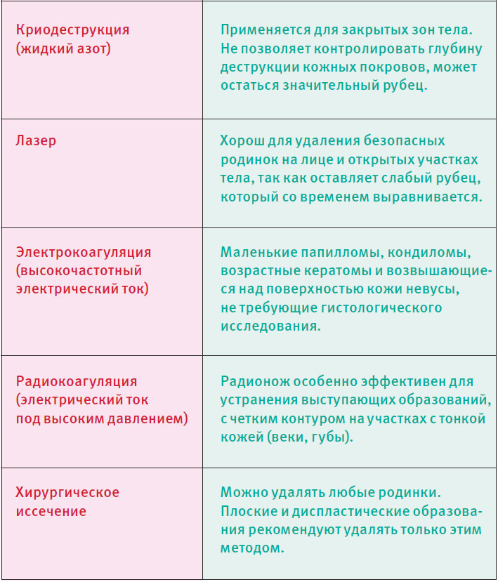 Нежелательные родинки удаляют разными способами (см. таблицу). Какой лучше, решает врач, исходя из индивидуальных особенностей пациента. Но ни в коем случае не пытайся избавиться от надоевших «украшений» самостоятельно, например, прижигая их. Такая самодеятельность может привести к воспалению, появлению рубцов и прочим неприятным последствиям. Впрочем, даже если родинки тебя не беспокоят, старайся заглядывать к дерматологу или онкологу раз в 3 года (людям старше 40 лет делать это лучше ежегодно) – на всякий случай, для профилактики.