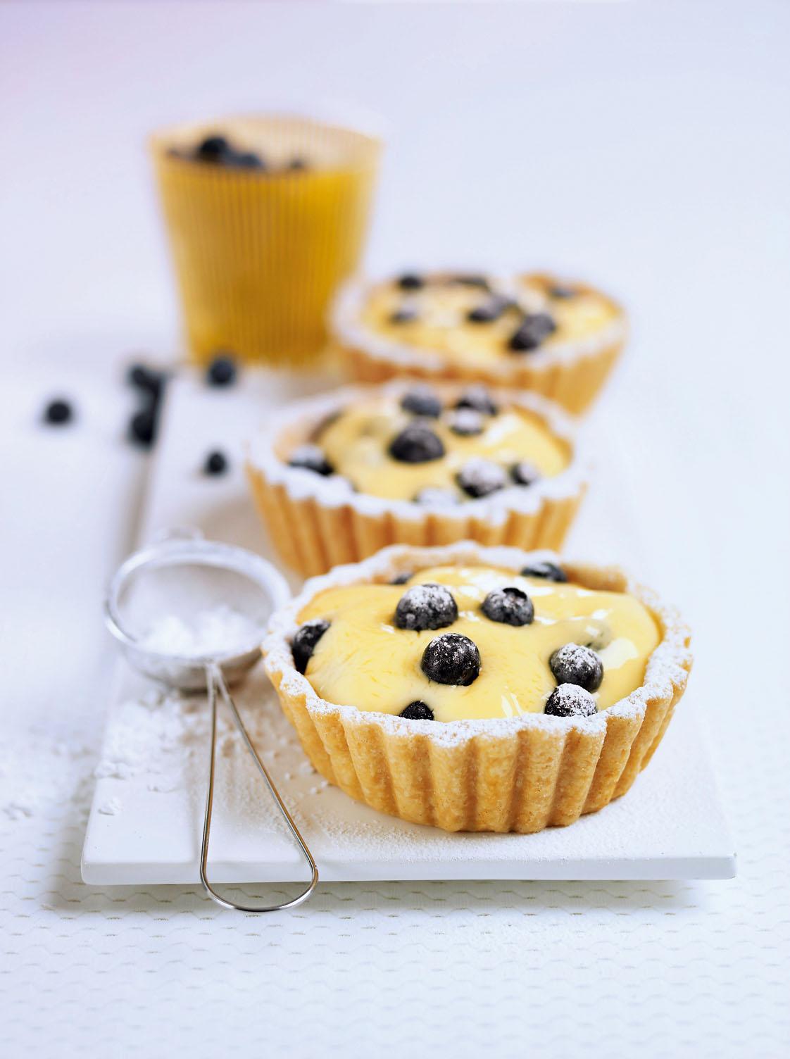 4. Получившийся крем распределить по тарталеткам и украсить ягодами. Перед подачей посыпать сахарной пудрой.