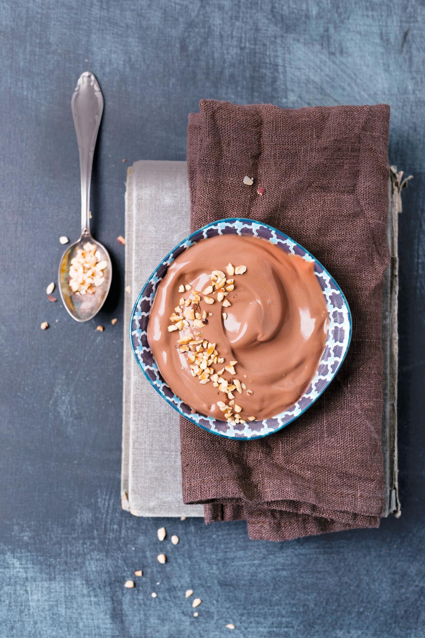 на 4 порции: • 500 мл молока • 50 г сахара • 2 ст. л. крахмала • 25 г порошка какао • щепотка соли • 30 г сливочного масла • 90 г горького шоколада • 2 ст. л. рубленого фундука