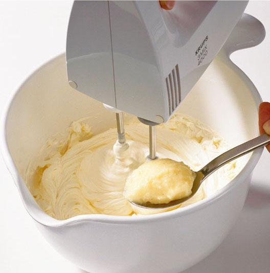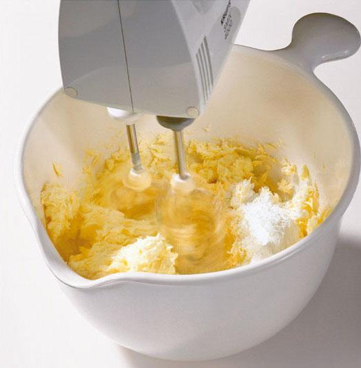 2. Чтобы приготовить крем для торта, сначала хорошо взбей миксером масло. Затем постепенно, не прекращая взбивания, добавляй пудинг, пока масса не станет однородной.