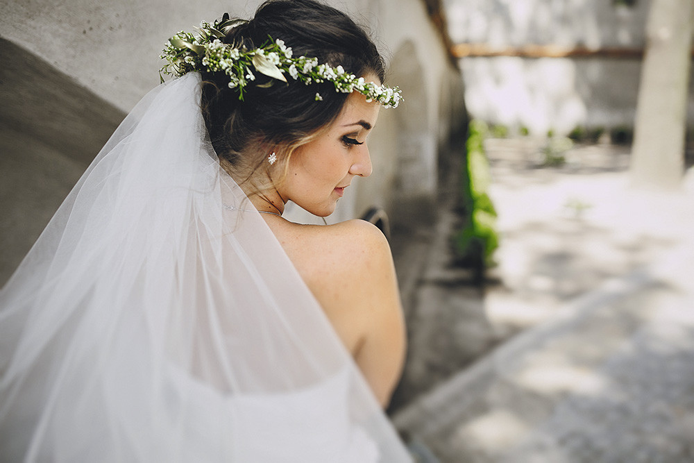 - Выбери свежие или качественные искусственные цветы, сочетающиеся с твоим платьем или его акцентами. В тренде сейчас как крупные одиночные цветы, так и россыпь мелких бутонов.