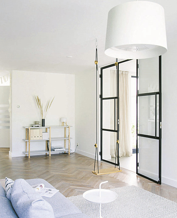 Отличным решением для темной комнаты станет выбор правильной межкомнатной двери. Обрати внимание на варианты со стеклянными вставками, которые будут обеспечивать помещению дополнительную порцию света благодаря соседнему пространству с хорошим освещением. Альтернативой может стать и стеклянная перегородка. Она не только зонирует территорию, но и позволяет сделать мрачную комнату более светлой и просторной.