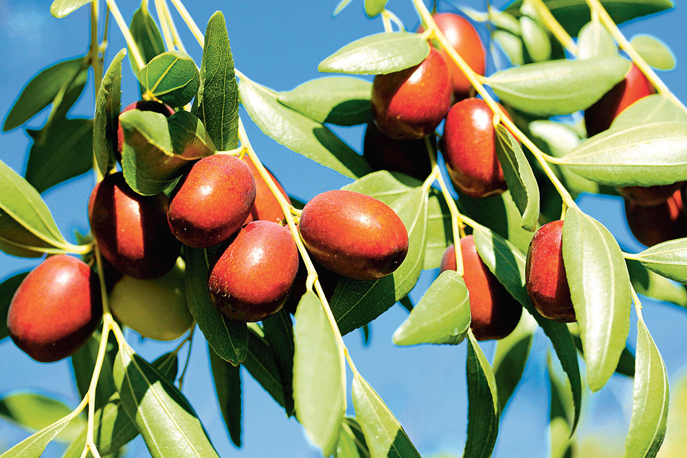 Другое название – китайский финик. Это плодовый кустарник, который вырастает до уровня небольшого дерева. Листочки мелкие, на стеблях и стволе есть иголки. Цветет в начале лета, плодоносит до середины осени. Можно собирать чуть недозрелые плоды – доходят до кондиции, когда немного полежат. Китайские финики гладкие, желто-коричневого цвета. Мякоть приятная, сочная и сладкая на вкус. В средней полосе можно выращивать в кадках (летом их выносят на свежий воздух), в южных регионах – в открытом грунте.