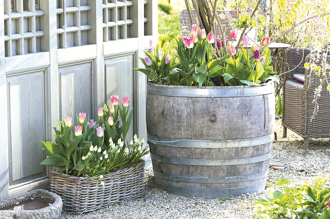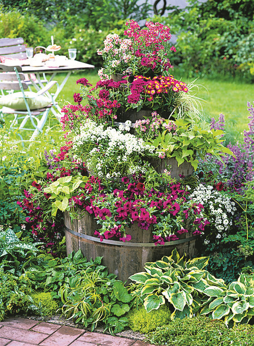 Маленькую емкость достаточно просто покрасить или обработать лаком, если нравится состаренный вид. Большую бочку можно разделить на две половины, разрезав вдоль или поперек. Цветники можно расположить поодиночке или объединить в группы. Хорошо растут в таких резервуарах ампельные цветы с небольшой корневой системой, суккуленты.