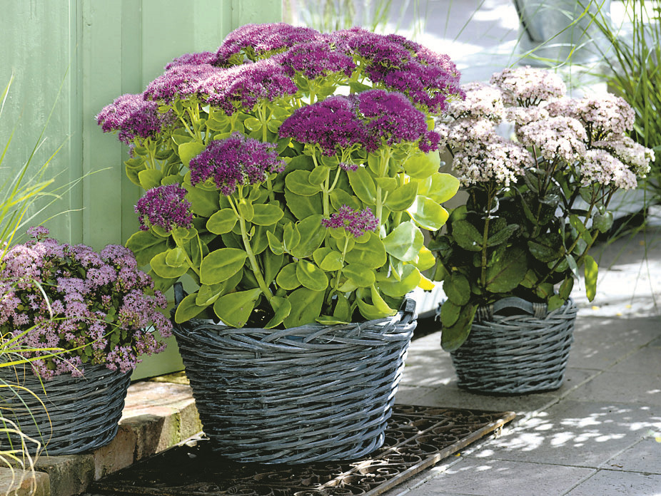 Очиток – относится к суккулентам, запасает влагу в толстых, мясистых листьях. Может обходиться без полива, достаточно природной влаги. Красиво цветет практически всю осень.