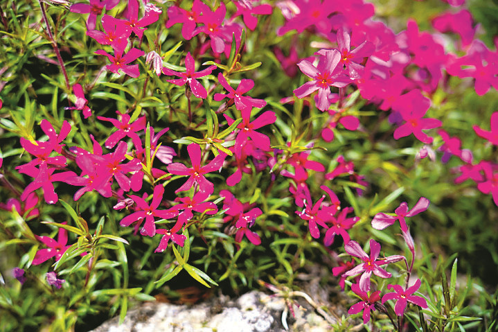 Флокс шиловидный – листочки мелкие, по форме напоминают шило. Осенью окраска меняется. Много сортов с белыми, лиловыми, голубыми, розовыми цветами. Хорошо растет на истощенном, неплодородном участке.