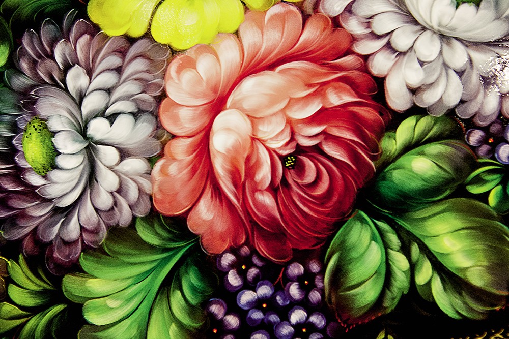 На лаконичном черном фоне цветут пышным цветом яркие пионы, алеют маки, распускаются роскошные розы, скромно глядят анютины глазки... Речь не о картинах маслом, а о знаменитых жостовских подносах. Их фирменные букеты ни с чем не спутаешь, в отличие, скажем от гжельской росписи, у которой есть схожие черты с делфтским фарфором из Голландии.