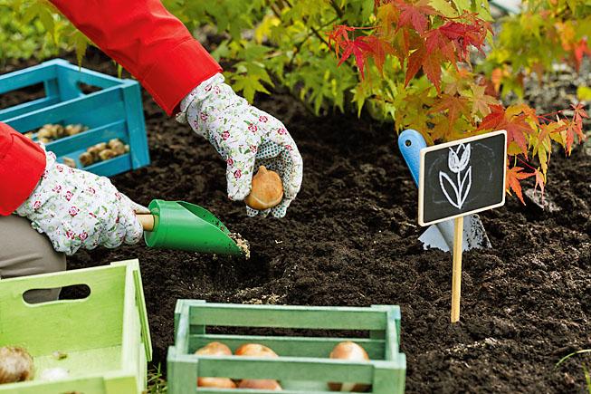 Тюльпаны, нарциссы, гиацинты, а также мускари, крокусы и другие ранние растения. Причем каждое – согласно точной инструкции на упаковке. Например, луковицы тюльпана, очень любимого россиянами цветка, нужно углублять в почву на 15 см. И не в хаотичном порядке, а согласно размеру (мелкие с краю, крупные – по центру) – соблюдение этого несложного правила обеспечит равномерные всходы. И еще один совет: позаботься о грунте – добавь в него известь или золу.