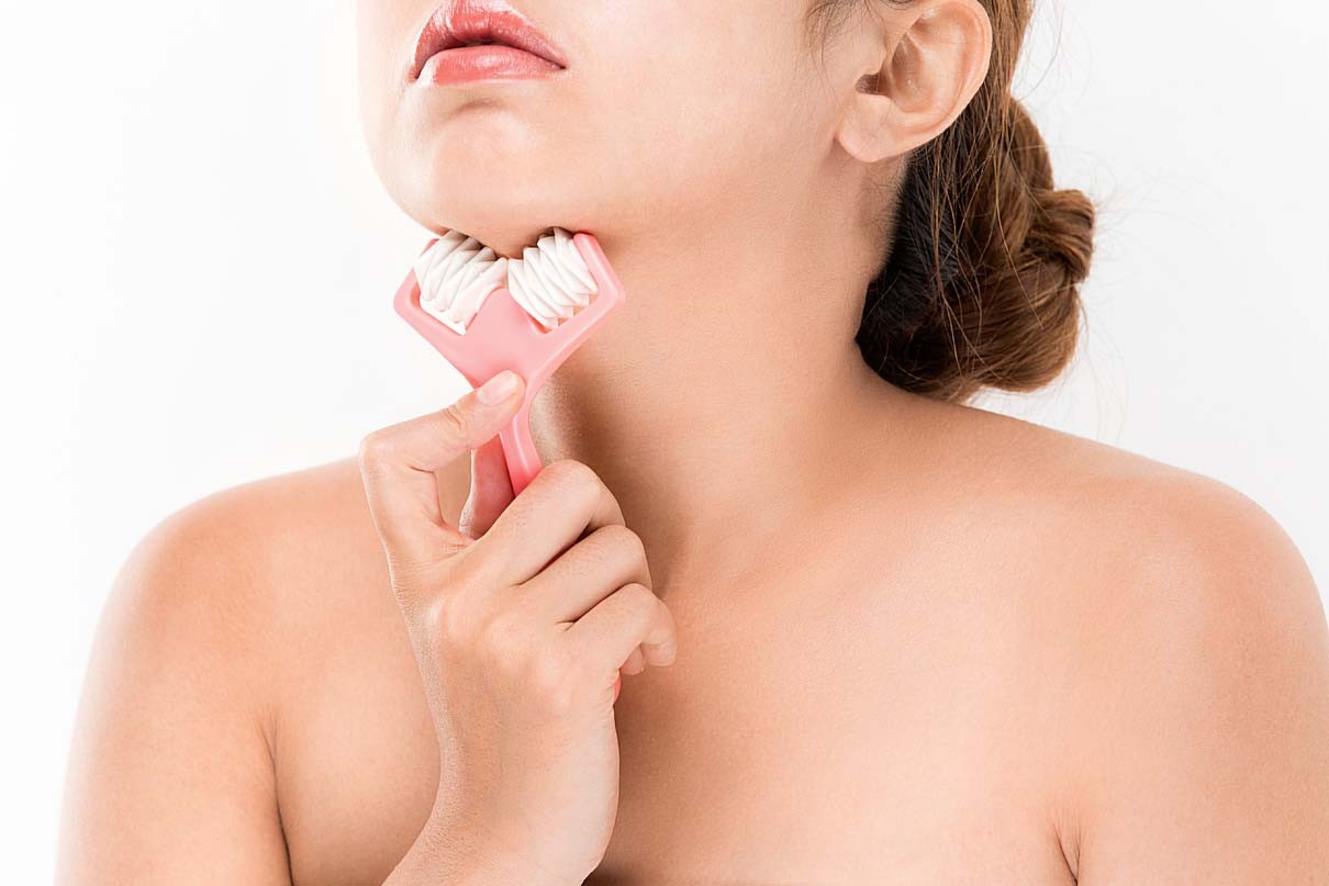 2. Расслабление подъязычно-челюстных мышц. Захвати одной рукой группу мышц, которые находятся ровно под подбородком, избегая шеи. Плавными движениями начинай разминать мышцы. Это упражнение следует выполнять минимум 3 раза в день по одной минуте.