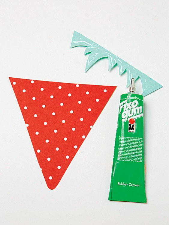 2. Из зеленой бумаги вырежи «хвостики». Приклей их сверху каждой заготовки.