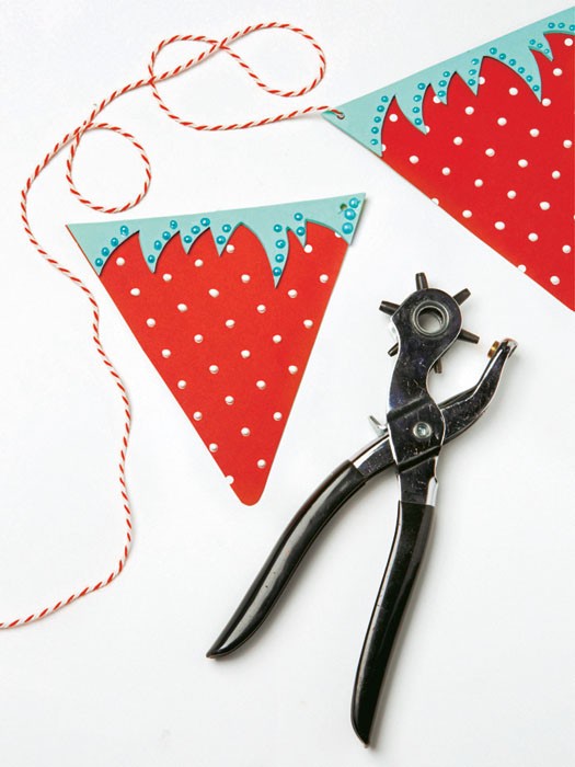 4. Сделай отверстия в верхних уголках «клубник» и протяни через них веревку. Готово!
