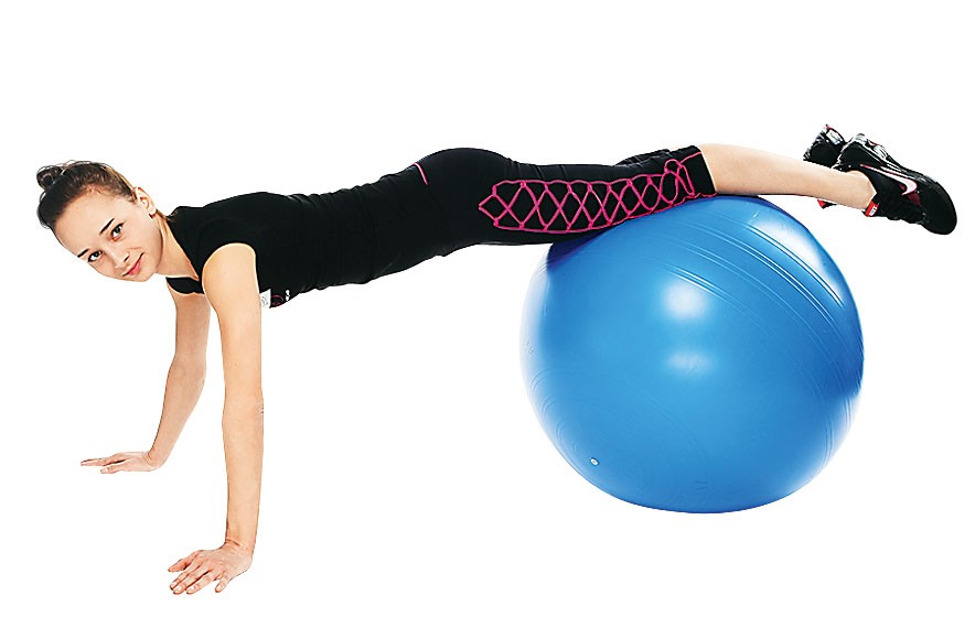 И. П.* Руки поставь немного шире плеч и упрись ими в пол. Ноги положи на мяч. Старайся не прогибаться в пояснице.