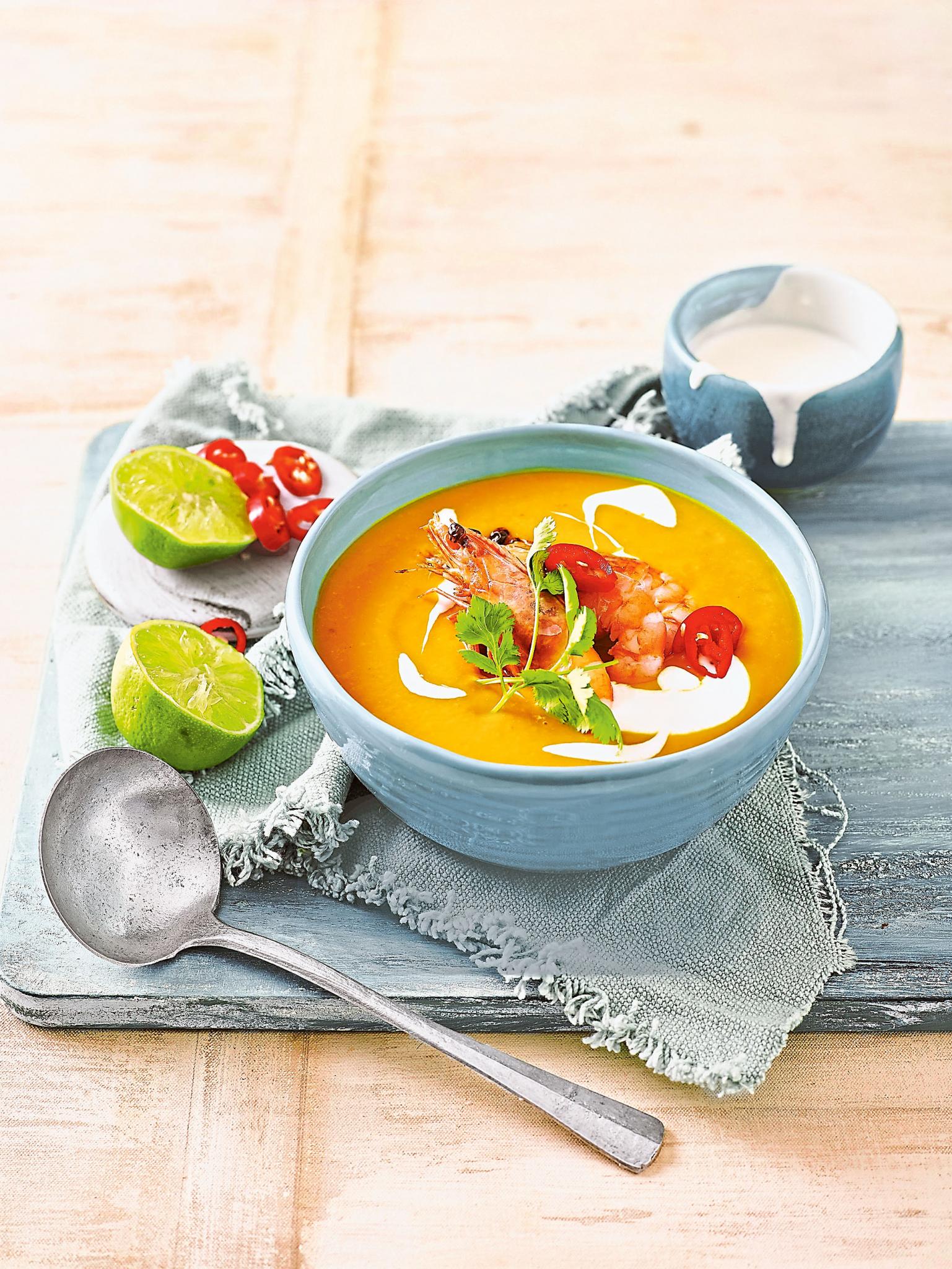 2. Влить горячий бульон и варить 5 мин. Креветки обжарить на оставшемся масле. Суп измельчить блендером, посолить и разлить по тарелкам. В каждую добавить креветки и сливки. Можно украсить перцем чили.