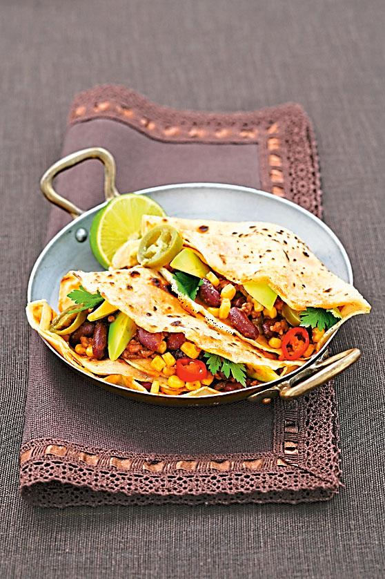 • 500 г рубленой говядины • 2 ст. л. растительного масла • 1 маленькая луковица • 1 ст. л. томата-пасты • 1 стручок перца чили • по 400 г консервированной фасоли и кукурузы • 1 авокадо • 4 лепешки-тортильи