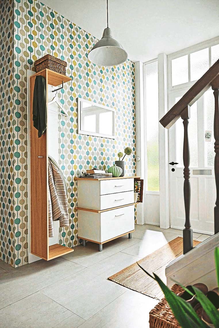 Оклей стену, на которой расположены зеркало и вешалка, оригинальными обоями (лучше всего остановиться на тех, которые можно мыть).