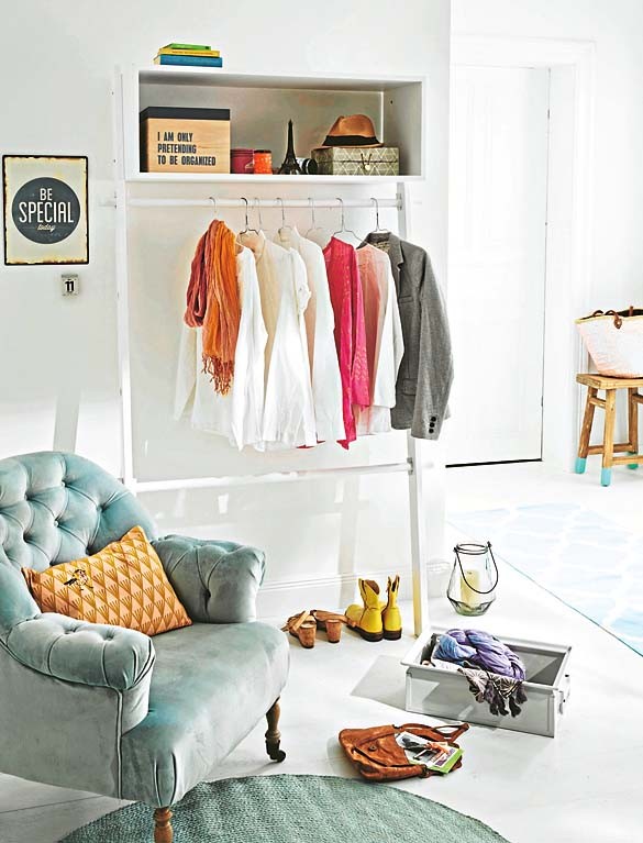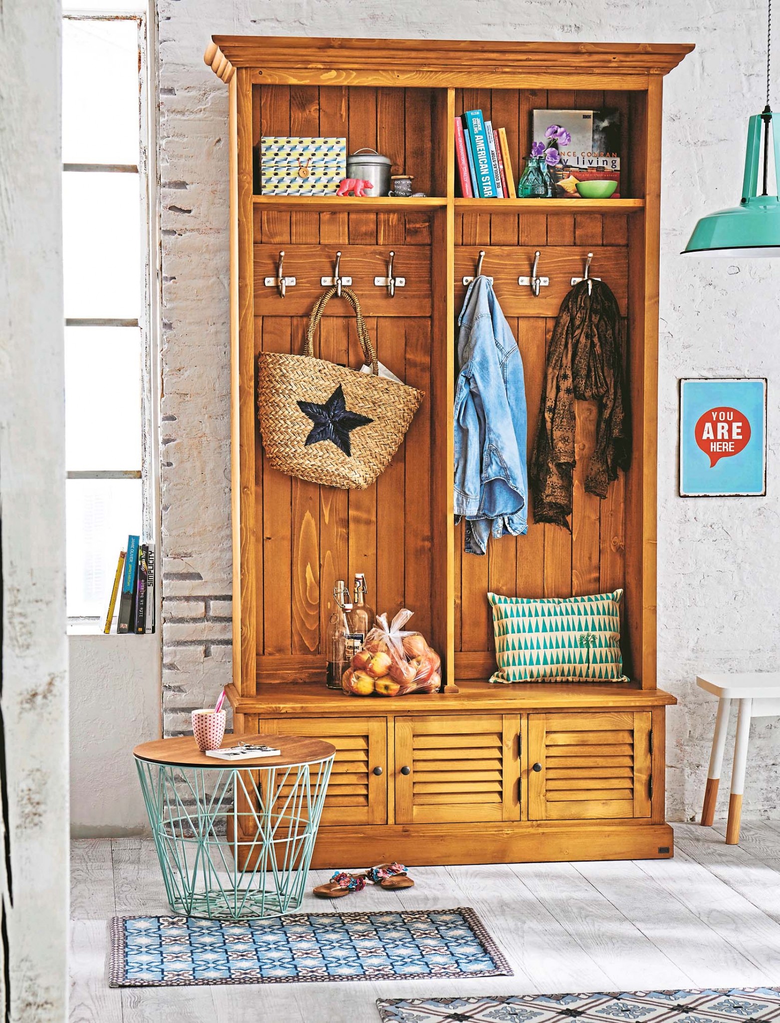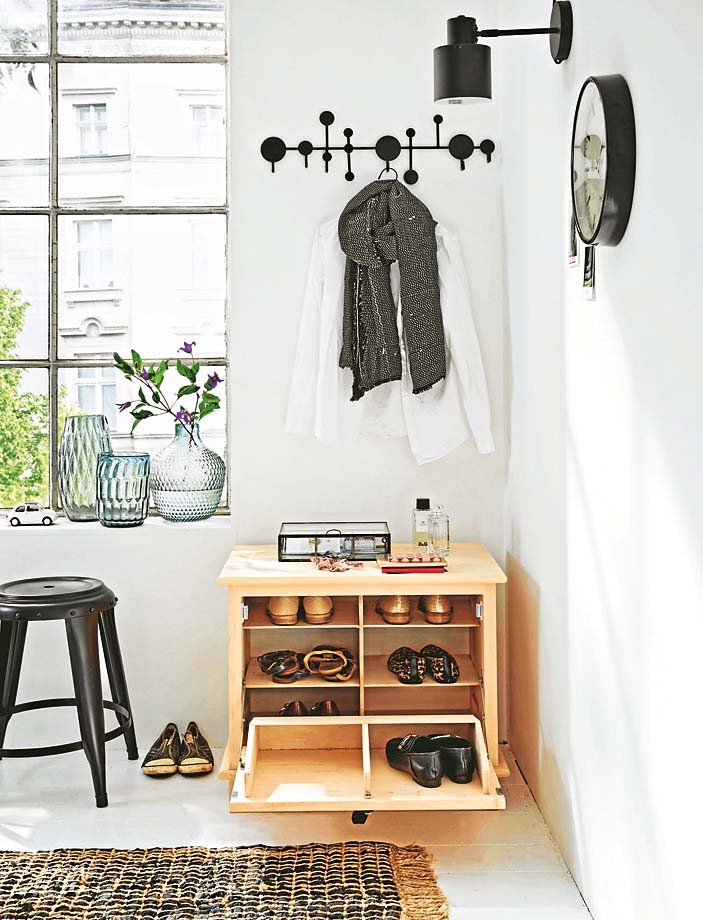 Пусть скамья или пуф будут иметь внутреннее место для хранения, а отдельно стоящая вешалка или шкаф – максимальное количество полочек и отделений.