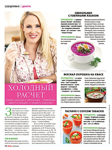 Холодные супчики летом – это замечательно, тем более, если получится еще похудеть на них. Я всегда на работу ношу свой обед, и в прошлом году у меня возникла идея, как уменьшить вес сумки. Решила попробовать обедать болгарским холодным супом. В понедельник я закупалась всем необходимым: огурцы, нежирный кефир, зелень – так, чтобы хватило на пять порций супа, на всю рабочую неделю. Хранила все это в офисном холодильнике. Так что с собой мне приходилось носить каждый день одно вареное яйцо. Ощущения от такого легкого обеда были замечательные, а через два месяца я заметила, что похудела. Взвесилась – три кг минус! Отличный результат без усилий. Галина П., Москва