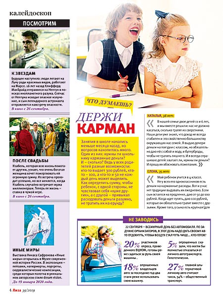 Хочу тоже высказаться по теме, которую вы обсуждали в «Лизе» от 21 сентября. Сколько же денег дать с собой ребенку в школу? Конечно, многое зависит от финансовых возможностей родителей. Но я считаю, сумма не должна быть постоянной. Я для своих сына и дочери установила определенный минимум. И если за неделю у них были только хорошие оценки и не было замечаний, на следующей неделе сумма удваивается. Кто-то скажет, я подкупаю детей, я от знакомых такое уже слышала. Но я не подкупаю, я даю им премию – за хорошую работу! Никого же не удивляет, когда на работе хорошие показатели влияют на размер выплат сотрудникам в конце года? Это реальная жизнь, и нам нужно готовить к ней детей. Алевтина, г. Москва
