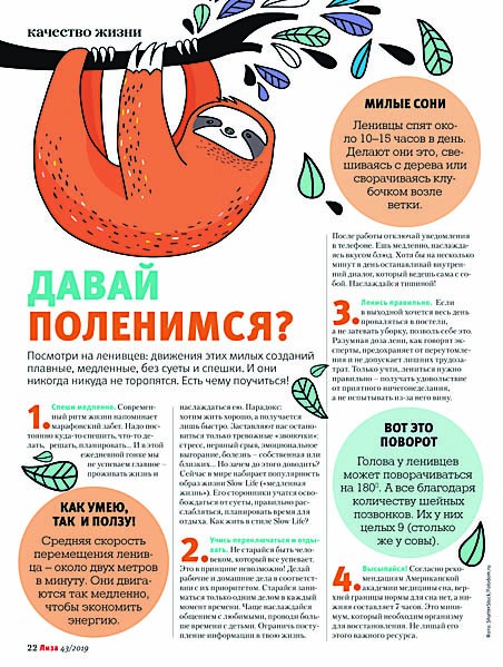 Очень в тему мне пришлась статья про пользу лени. «Давай поленимся?» – спрашивает любимый журнал. А давайте! Все мы сейчас живем в постоянном стрессе. Забот и так много, а нас призывают делать еще больше, быть успешными. Так мы и живем на пределе сил – напахавшись на работе, бежим на фитнес или на урок иностранного языка. Если не сами, то детей тащим на занятия. Но... зачем? Так ли уж это нужно? Только здоровье тратим – свое и наших детей. Чаще надо отдыхать, больше спать. Недавно прочитала одну китайскую книгу, автор утверждает, что все болезни организм может вылечить сам – во сне! Это, конечно, слишком смелая теория, но что-то в ней есть. Я вот однажды провалялась все выходные в постели – спала, читала, ела и снова спала. И всю следующую неделю чувствовала: горы могу двигать! Альбина Серова