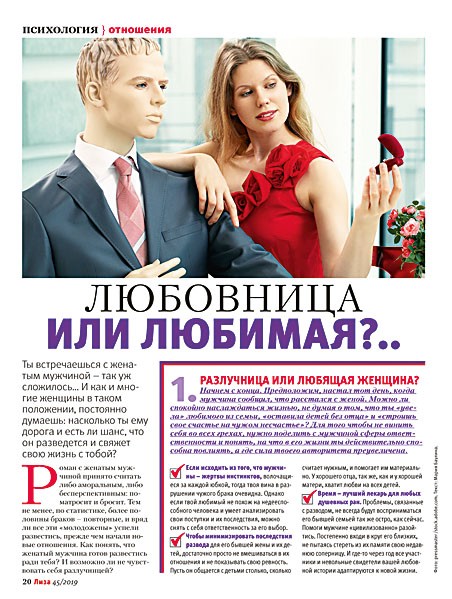 Прочитала в №45 статью «Любовница или любимая?..» Когда в моем браке начался кризис, муж завел женщину на стороне. Я это знала, но скандалов не устраивала. Думала, она исчезнет вместе с проблемами. Но, видимо, муж в нее влюбился, мы развелись. Женщину, которая уводит мужчину из семьи, как ни назови, все равно она – разлучница... Ирина