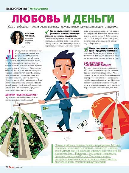 В день, когда я прочитала статью «Любовь и деньги», моя подруга подала на развод. Я тогда подумала: «В точку». Но подруге показать журнал не решилась, она и так переживает. Какая это была красивая история: встреча со старым знакомым через много лет, вспышка любви, роман, красивая свадьба... А еще – дорогие подарки, которыми романтический – и богатый! – герой осыпал возлюбленную... И, как говорит еще одна наша подруга: «Трудно любить мужика на яхте! Как понять, его ты любишь или деньги?» Очень скоро брак развалился. Так что, девушки, если полюбите мужика на яхте, о бюджете договаривайтесь на берегу. Варвара, г. Москва