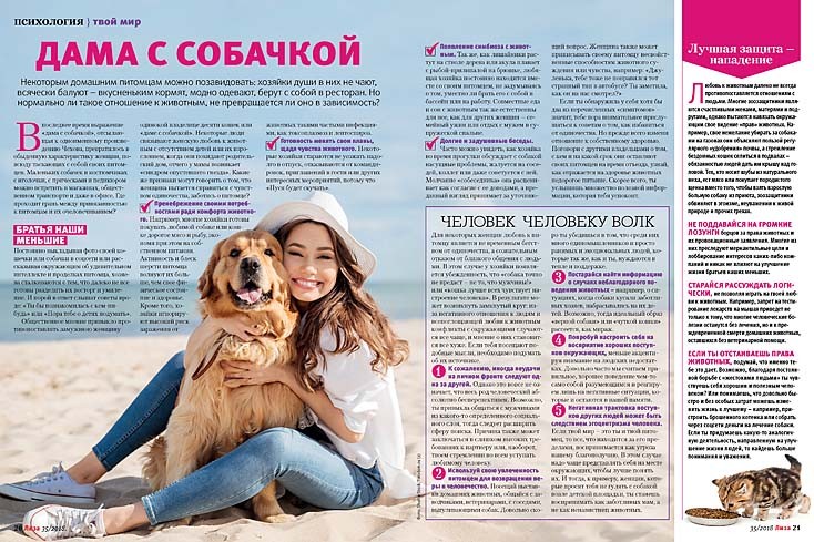 В статье «Дама с собачкой» вы описали черты моей подруги! Год назад за две недели до свадьбы она рассталась со своим женихом – выяснилось, что он ей изменяет. Она очень тяжело переживала разрыв. Но девушка она симпатичная, умная, так что мы надеялись, что она погрустит-погрустит, а потом успокоится и выйдет замуж. Тем более и претенденты быстро нашлись. Но она ни на кого смотреть не хочет. Повторяет: «Все мужики – предатели». Завела себе маленькую собачку, ходит с ней везде и... разговаривает. Прямо как у вас в статье! Тратит на нее кучу денег, покупает ей дорогие наряды. Ее мама плачет, боится, что теперь внуков ей не дождаться. Я понимала, что у нее проблемы, но не знала, как с ней поговорить. Постараюсь показать ей вашу статью. Может быть, она хотя бы задумается. Анна З., по e-mail