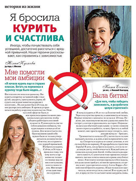Очень интересно было читать в №42 истории девушек, которые бросили курить. Я тоже несколько лет назад отказалась от вредной привычки, и это помогло мне найти счастье – я вышла замуж во второй раз и в возрасте 40+ родила третьего ребенка! Конечно, я даже не думала, что все так произойдет. Я была одинока, хотелось положительных перемен в жизни, и я решила с чего-то начать – сама. Бросила курить, а через три месяца познакомилась с прекрасным мужчиной. И когда у нас с ним все уже было серьезно, я узнала, что он не выносит даже вида курящих женщин! Вот так одна положительная перемена может притянуть к нам другую. Главное, надо сделать первый шаг. Юлия, по e-mail