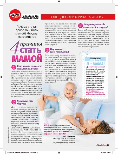 Спецпроект «Ты сильнее», который вы делаете вместе Минздравом, очень нужный! Читаю много разных женских журналов, но давно уже не видела статей на такую тему: какую важную роль в нашей жизни играет материнство и как важно готовиться к нему, беречь здоровье. Сейчас модно писать о другом – как хорошо устроиться, сделать карьеру, соблазнить мужчину... Этой идеей соблазнения словно пропитано все пространство вокруг. А о последствиях кто-нибудь расскажет? Да, мы не можем защитить своих подрастающих дочерей от проблем, но предупредить об этом – наш долг! Я обязательно приму участие в конкурсе «Я – мама!» и расскажу, как материнство повлияло на мою жизнь. Елена Е., по-email
