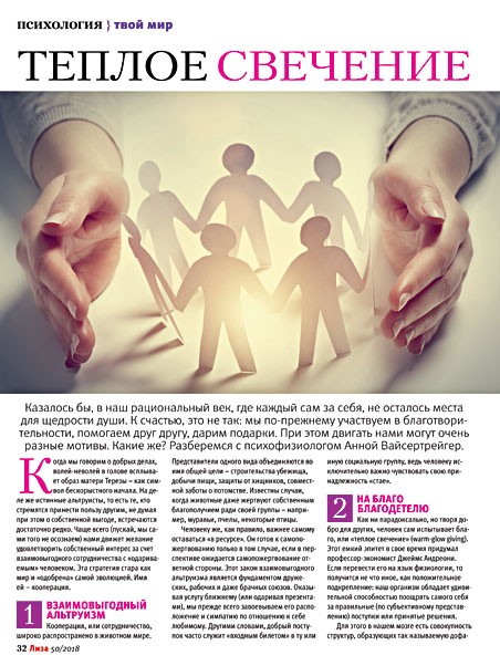 Обычно я перелистываю свежий номер «Лизы» по дороге с работы, а уже дома читаю. Но статью «Теплое свечение» прочитала сразу в автобусе, когда ехала из города к себе в поселок. Я никогда не задумывалась, почему люди делают добрые дела. Но неужели это так важно? У каждого свои мысли на этот счет и свои возможности, чтобы творить добро. Далеко ходить не надо. Я ни разу не переводила деньги на счета благотворительных фондов. Но в праздники вместе с подругой устраиваю скромные посиделки для своих стареньких соседок, которые живут на нашей улице. Не знаю, может, для кого-то это и ерунда, но мне приятно видеть, как радуются эти женщины. Валентина, Тверская обл.