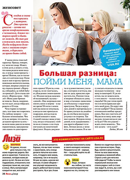 Зaхотелось откликнуться на письмо в рубрике «Женсовет» в 4 номере. Я думаю, непонимание между матерью и дочерью возникло из-за того, что у них обеих сложный характер, а не из-за разницы в возрасте. У меня есть подруга Марина, которую мама родила в 42 года. У них всю жизнь были прекрасные отношения. Мать никогда ничего ей не навязывала, очень внимательно относилась к ее интересам, наклонностям. Например, когда выяснилось, что у Марины есть способности к музыке, мама не просто отдала ее в музыкальную школу, но и водила на концерты известных музыкантов, ради этого они иногда даже ездили в Москву. И никогда они не ссорились, были как близкие подруги. Алия, 49 лет, г. Казань