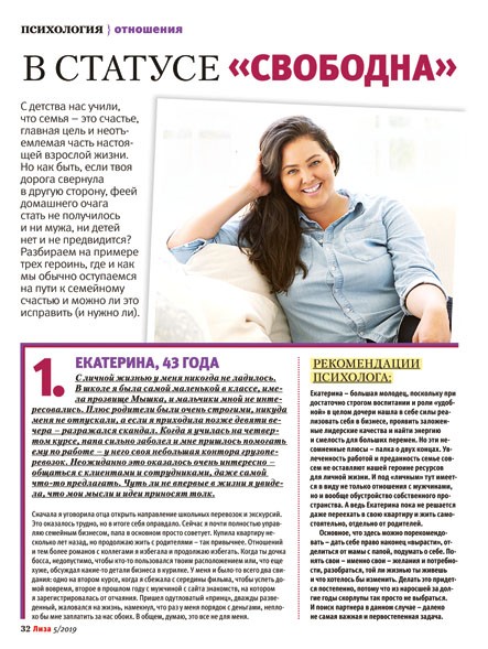 Спасибо вам за рубрику «Психология» в №5! Подборку историй про женщин, которые предпочли семейной жизни свободу, я всем своим тетушкам показала. И сохранила на всякий случай. Потому что в нашем обществе почему-то женщина без мужа по-прежнему считается неудачницей. Но это какой-то устаревший взгляд на жизнь, согласны? Я, например, замужем никогда не была и менять ничего не собираюсь. Романы были и, кстати, они и убедили меня, что я не создана для семьи. Не представляю себе мужчину, с которым могла бы ужиться. Обсуждать свои планы даже с самым хорошим человеком я не хочу. И уж тем более – подстраиваться под него. Мне нужна свобода, и я ее сохраню! Алла, по e-mail