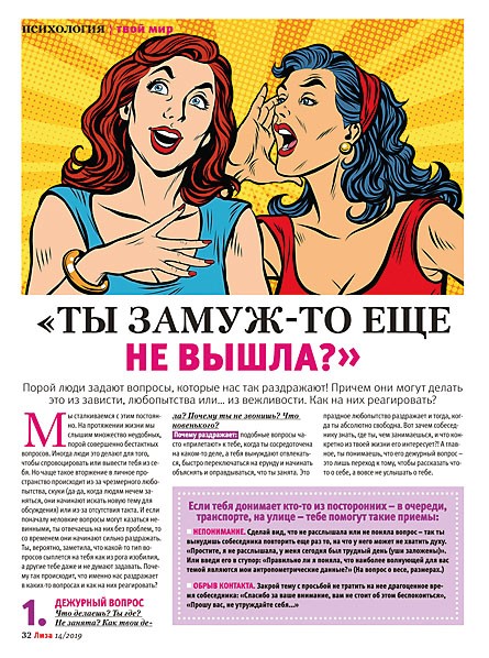 Порадовала статья в № 14 «Ты замуж-то еще не вышла?» Очень остроумно и актуально. Я после школы уехала из своего городка, поступила в областной университет, потом меня занесло еще дальше – в Питер. У меня интересная жизнь, хорошая работа, друзья... Я счастлива! Но мои бывшие одноклассницы этого не понимают или делают вид. Приезжаю к родителям, вижу во дворе расплывшихся «теток». И только когда они здороваются, понимаю – это же мои ровесницы, подружки по двору. Стараюсь скрыть шок от их вида, а они: «Ты замуж-то вышла?» И когда они слышат, что я не замужем, говорят с чувством превосходства: «Ну, не расстраивайся». И смех, и грех. Надо перед отпуском статью вашу перечитать. Анастасия, С-Петербург