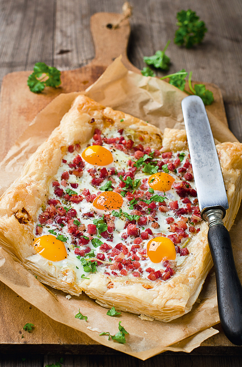 - Духовку нагреть до 180°. По лепешке, смазанной сметаной, распределить приготовленную начинку. Можно сделать несколько углублений и выпустить свежие яйца. Выпекать около 15 мин до легкого подрумянивания. На стол подать в горячем виде.
