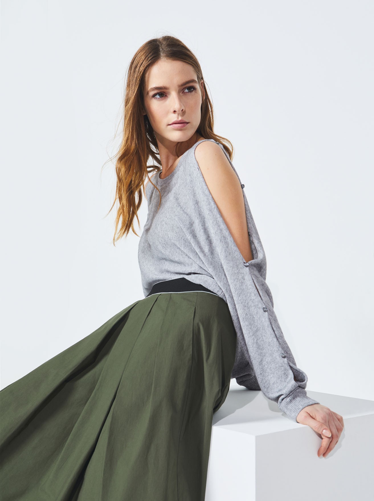 Юбка приглушенного зеленого оттенка дополнит и деловой, и повседневный образ. В первом случае сочетай ее с белой сорочкой и кожаными аксессуарами: сумкой, ремнем, обувью. Во втором – носи со свободным топом или джемпером. Дополняй крупной бижутерией.