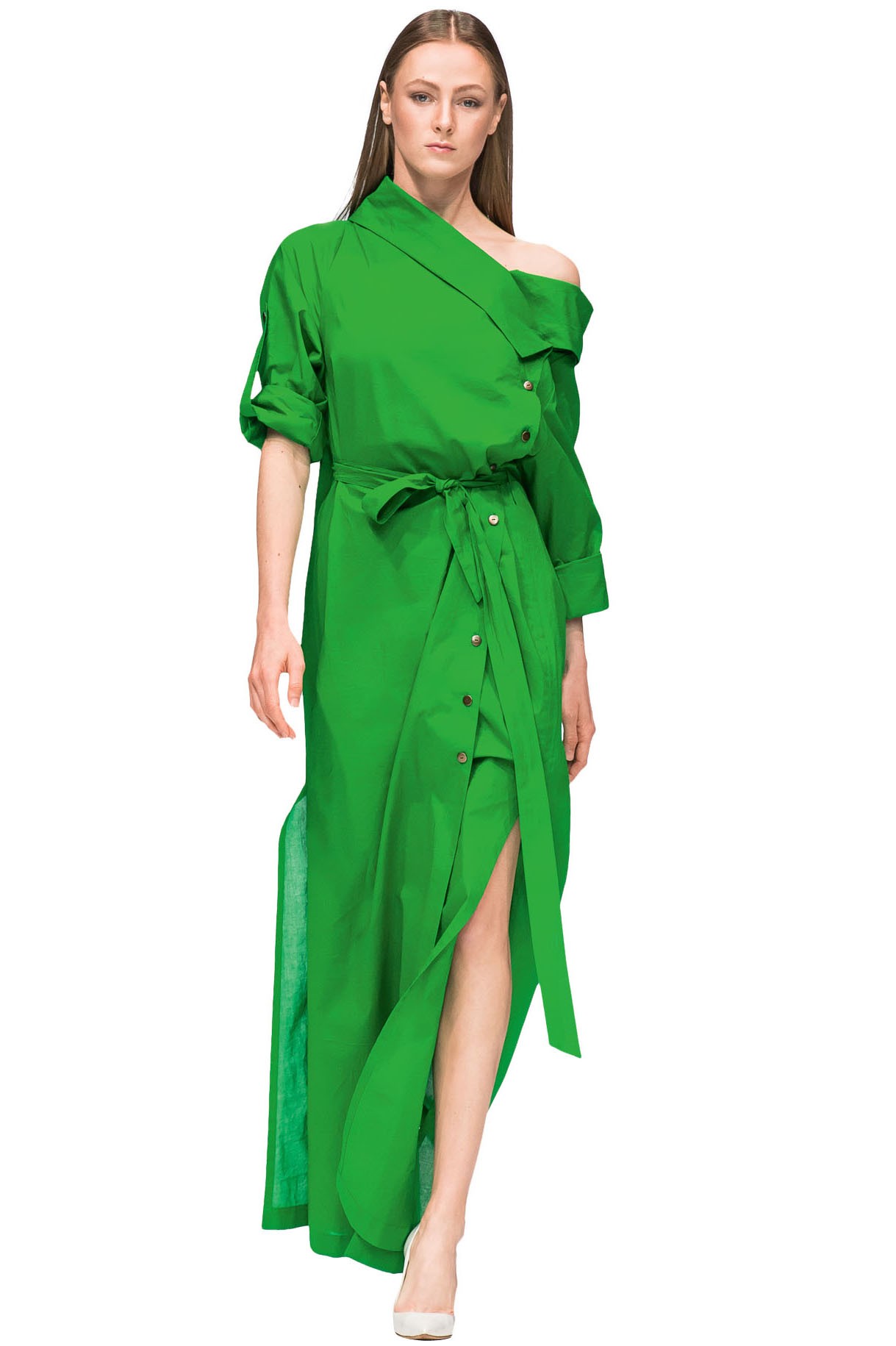 Не обходи стороной вещи насыщенного зеленого цвета! Чтобы наряд смотрелся элегантно, выбирай однотонные модели. Например, платье-рубашку в пол.