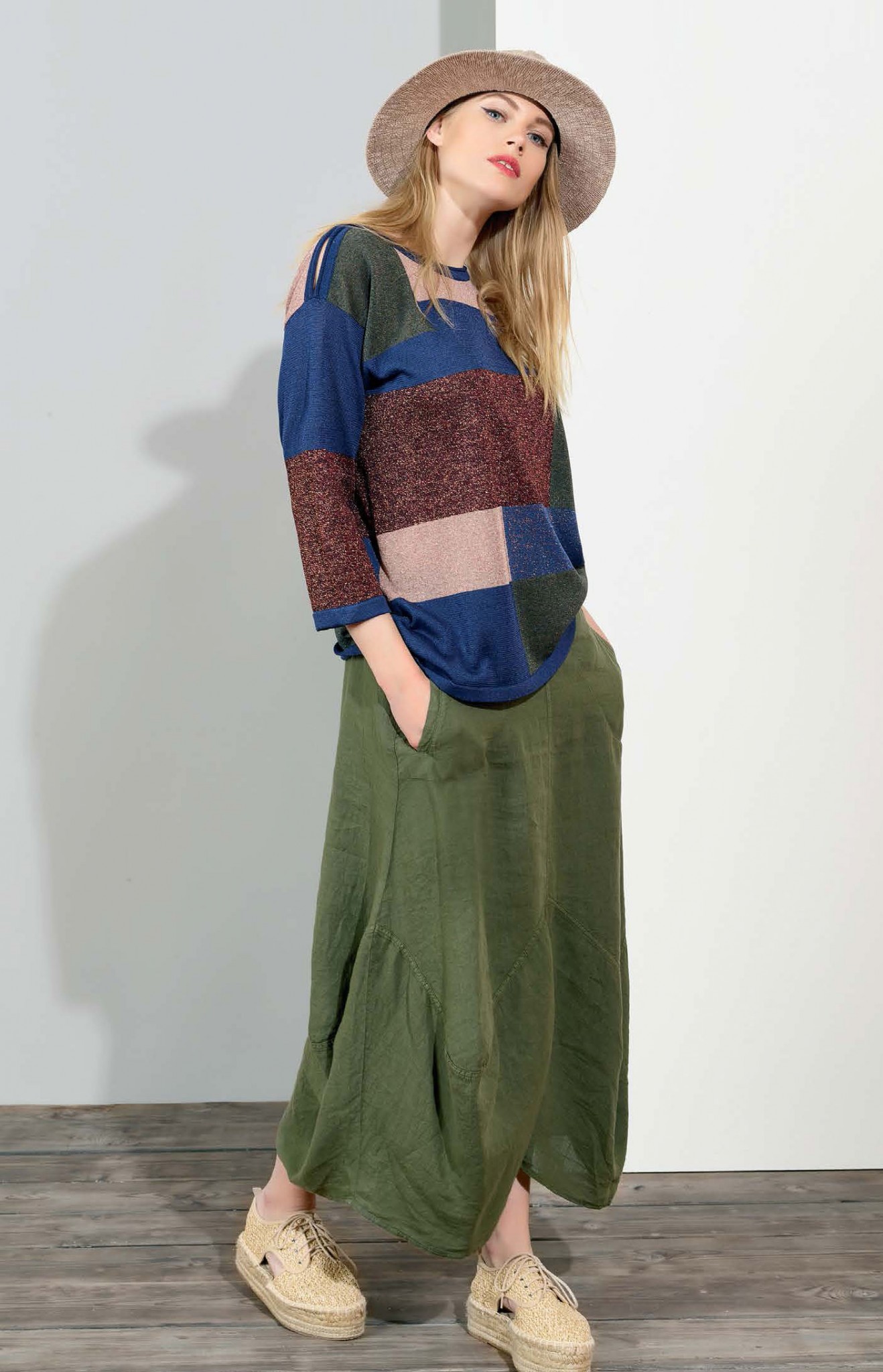 Натуральные ткани и зеленый цвет – идеальная пара! Обрати внимание на вещи из плотного хлопка или льна. Например, длинная свободная юбка травянистого оттенка отлично впишется в наряд для прогулки или отдыха. Цвет зелени дополнят вещи всех оттенков синего и аксессуары из модной в этом сезоне соломки.